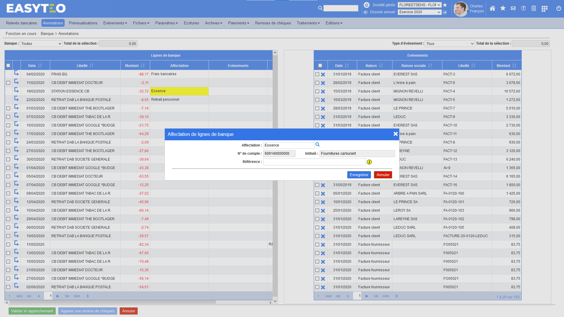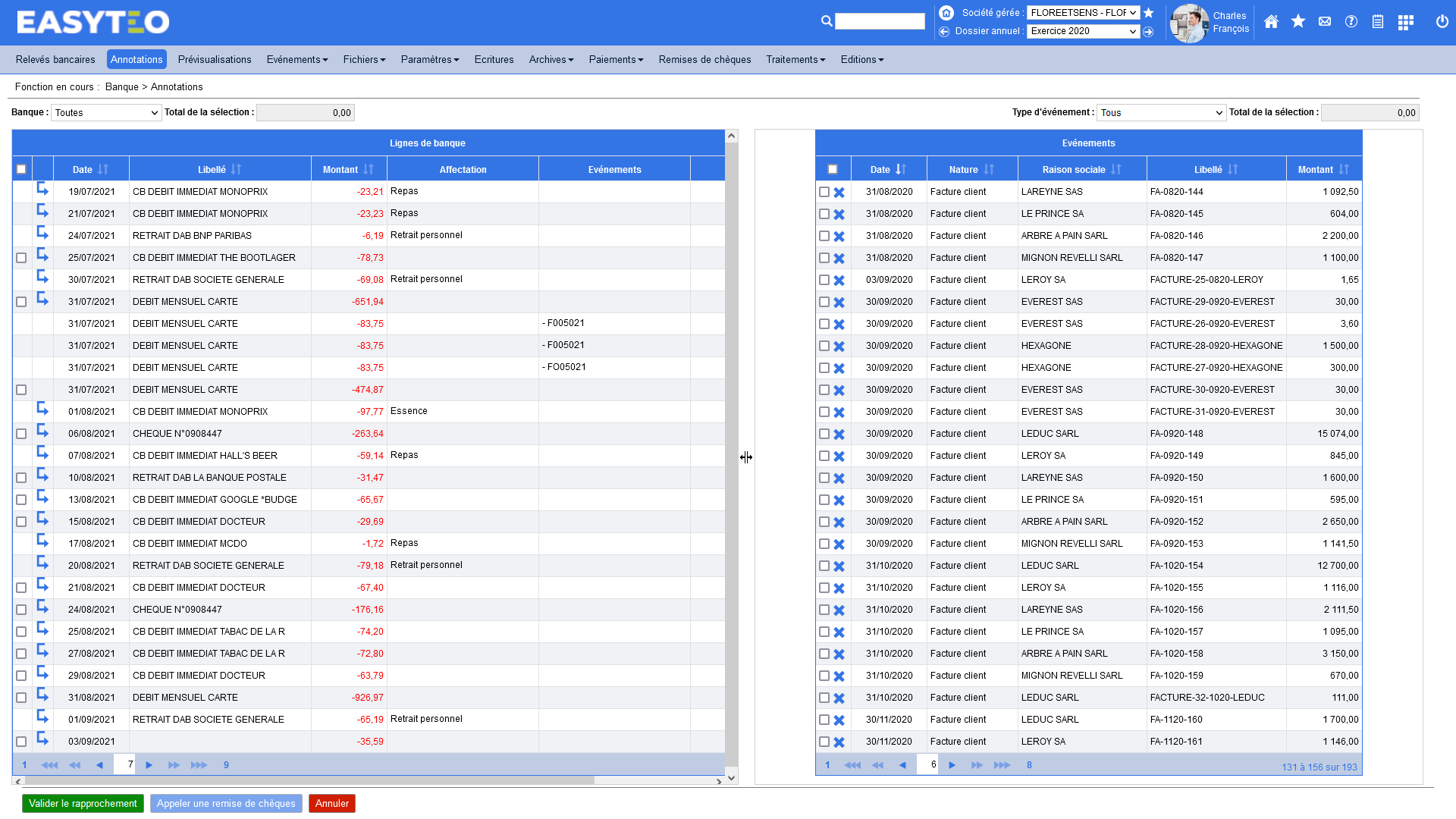 - Annotation des lignes en les rapprochant avec des factures et avoirs clients et fournisseurs émis depuis d'autres modules Easyteo
